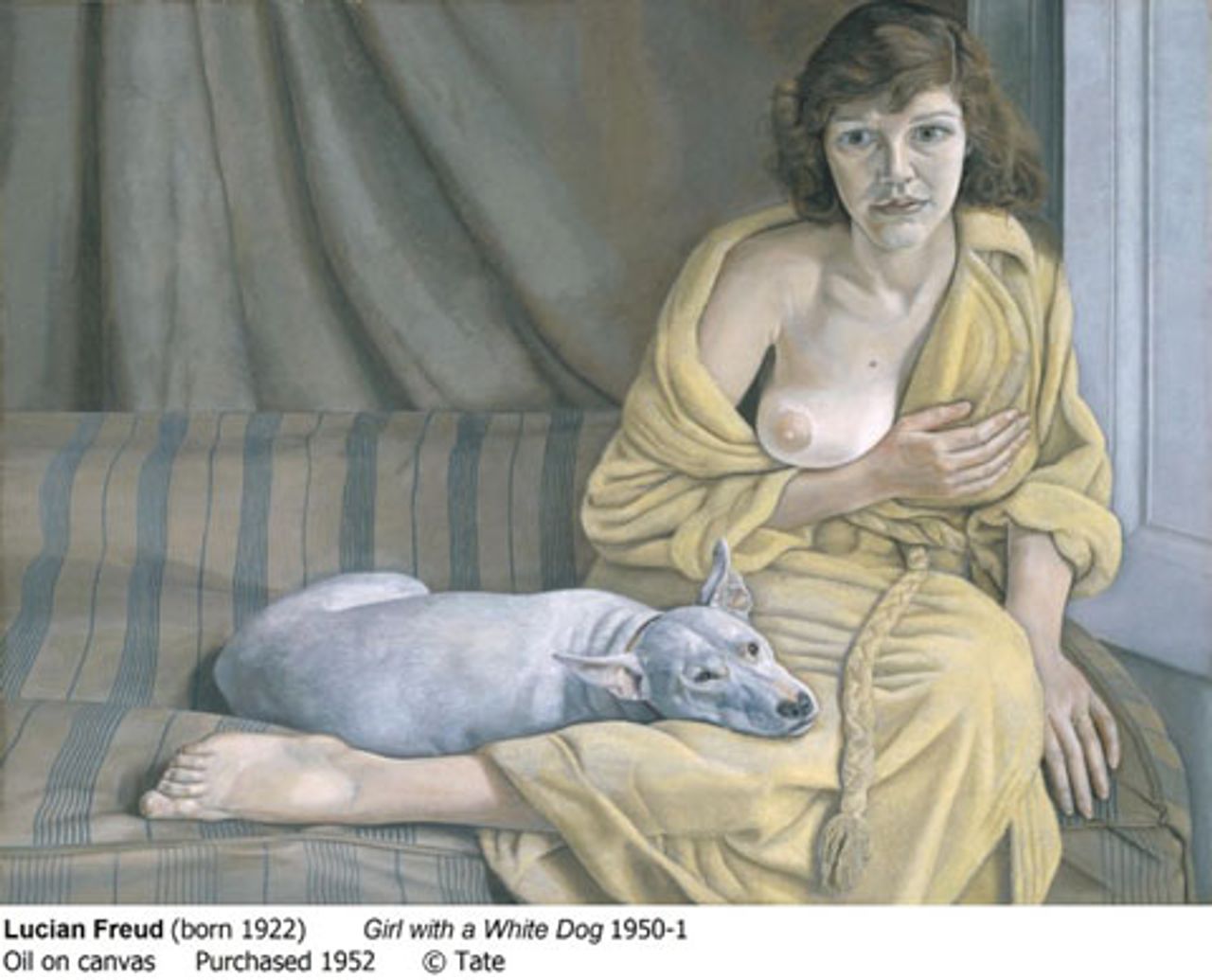 Freud’s first series of portraits were of his first wife Kitty, daughter of sculptor Jacob Epstein, whom he married in 1948. The marriage was only to last four years. In the beautifully poignant Girl With a White Dog (1951–52), painted towards the end of the relationship, one can sense the developing problems. Love, romance, eroticism seems to be evaporating before our eyes. Kitty, dressed in her night gown and curled up on a mattress, is melancholic, staring out rather vacantly. She still wears her marriage ring, but self-consciously covers her left breast. Even that symbol of loyalty and faithfulness, the dog, one of a pair of bull terriers given to the couple as a wedding present, looks forlorn.