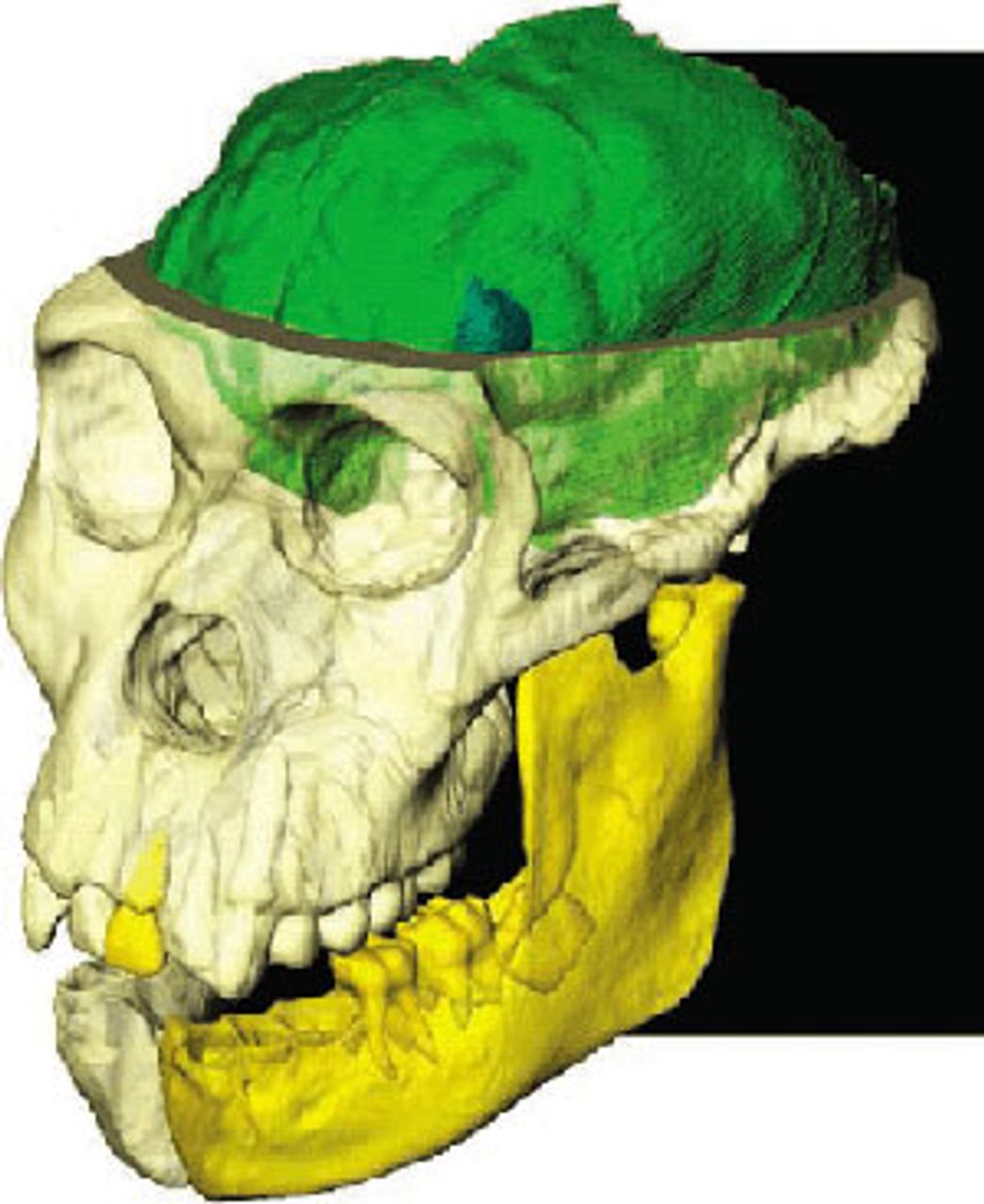 This technology has yielded the most detailed image yet created of an early hominin brain (such an image is called an “endocast”). Although the boy’s brain was barely larger than that of a chimpanzee, the researchers propose that there are distinct changes in architecture resembling developments in later humans. Of special importance are enlargements in frontal areas of the brain known to be associated with social behavior, language, and probably tool-making. Preliminary studies appear to indicate that these changes distinguish this brain from those of other known australopithecine specimens and indicate that while the brain is smaller than that of H. habilis, in sediba it has been reorganized.