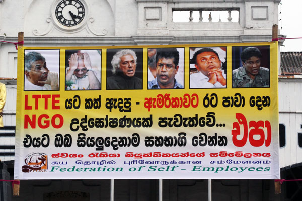 විරෝධතාව කඩාකල්පපල් කිරීමේ ප‍්‍රයත්නයක ආන්ඩුව කල්ඇතිව ම නිරතව සිටියේ කම්කරුවන් හා දුගීන්ගේ අයිතීන්ට පහරදීමේ වැඩපිලිවෙල පස්සට නොගන්නා බව ඇඟවුම් කරමිනි. "දේශද්‍රෝහී අලි-කොටි ගිවිසුම යලි ක‍්‍රියාත්මකයි", "ජිනීවා මානව අයිතිවාසිකම් රට ඇතුලෙම රඟ දැක්වීම ඇරඹෙයි" යන හෙඩිම යටතේ නරුම ලෙස වර්ගවාදය ඇවිස්සීමේ පත‍්‍රිකාවක් ශ‍්‍රී ලංකා නිදහස් පක්ෂයේ වෘත්තීය සමිති සංවිධානයක් විරෝධතාවට කලින් දිනයේ බෙදා හැරියේ ය.