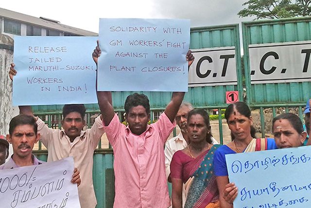 “සිරගත කර ඇති ඉන්දියාවේ මරුති-සුසුකි කම්කරුවන් වහා නිදහස් කරනු!” පුවරු රැගත් වතුකම්කරුවෝ