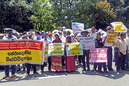 වැඩි වැටුප්, වෛද්‍ය රක්ෂනයක් සහ විශ‍්‍රාම වැටුපක් ඇතුලු ඉල්ලීම් කීපයක් මත වර්ජනයේ නිරතව සිටින රජයේ විශ්ව විද්‍යාලයන්හි අනධ්‍යන කම්කරුවෝ ඊයේ කොලඹ දී විරෝධතා පා ගමනක නිරත වූහ. දිවයින පුරා පිහිටි සියලු රජයේ විශ්ව විද්‍යාල සහ ඊට අනුබද්ධ ආයතන සියල්ල නියෝජනය කරමින් කම්කරුවන් 4000 ක් පමන එයට සහභාගි වී සිටියහ.