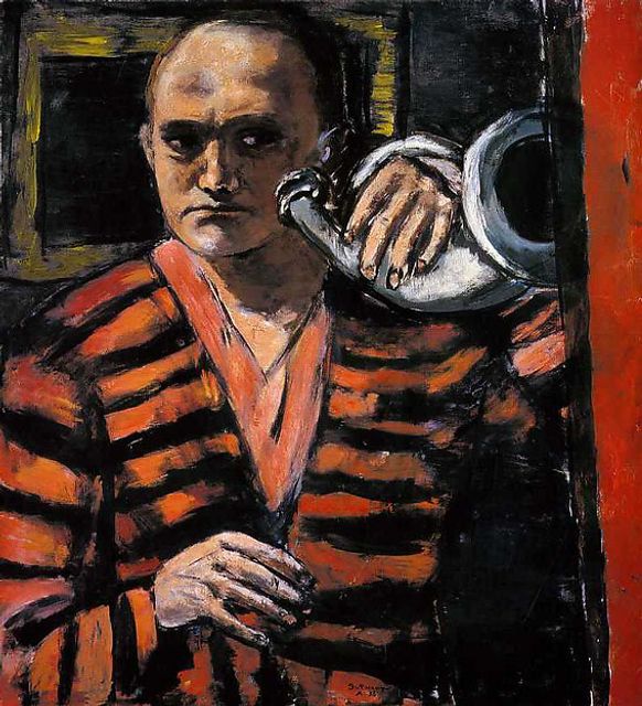 මැක්ස් බෙක්මාන්, ඔස්කාර් කොකොස්ච්කා සහ ඔට්ටෝ ඩික්ස්, ප්රකට නාමයන් අතරට ඇතුලත් වී තිබෙන අතර යුද්ධයෙන් නොමැරී ජීවත් වුනු ප්රති-නාසීන් වූ ඔවුන්ගෙන් බෙක්මාන් සහ කොකොස්ච්කා විප්රවාසීව ද, ඩික්ස් ජර්මනිය තුල ද දිවි ගෙවී ය. බෙක්මාන් (1884-1950), ඇම්ස්ටර්ඩෑමයේ විප්රවාසයට යාමෙන් වසරකට පසු, 1938, ඔහුගේ ප්රසිද්ධ නලාවක් සහිත ස්ව-ආලේඛය මගින් නියෝජනය වේ. මෙම කලාකරු, “සංස්කෘතික බොල්ශෙවිකයෙක්” වශයෙන් නාසීන් විසින් ලේබල්ගත කරන ලද අතර, 1933 දී ඔහු ගුරු වෘත්තියෙන් ඉවත් කරන ලදී. ඔහුගේ බොහෝ ස්ව-ආලේඛ අතරින් එකක් වූ මෙහි, බෙක්මාන් නලාව මේ දැන් නාද කර, ප්රතිචාරයක් නොපෙනෙන බැවින් හුදකලා සහ දුර්මුඛ හැඟුම් දැක්වීමකින් නරඹන්නා දෙස බලා සිටියි. ඔහු පැහැදිලිව සිතමින් සිටින්නේ තමා උපන් භූමියෙන් පිටත්ව යන්නට මග පාදන ලද වාතාවරනයන් ගැනය. ව්යසනයේ පූර්ව සංඥා නොවරදිනසුලු වන අතර, එසේ වන්නේ අතීතාවලෝකනයක් ලෙස පමනක් නොවේ.