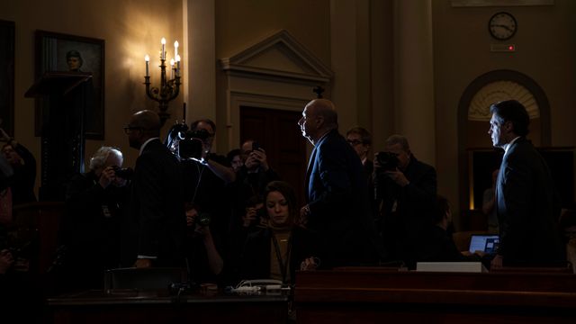 මැද සිටින යුරෝපා සංගමයේ එක්සත් ජනපද තානාපති ගෝර්ඩන් සොන්ඞ්ලන්ඞ්, 2019 නොවැම්බර් 20 වන බදාදා වොෂිංටන් හි කැපිටල් හිල් හි කොන්ග්‍රස් ඔත්තු සේවා කමිටුව ඉදිරියේ සාක්ෂි දුන් දිනයක් අවසන් කරයි. (ඇනා මනිමේකර්/ පූල් ෆොටෝ ඒපී මගින්) (Anna Moneymaker/Pool Photo via AP)